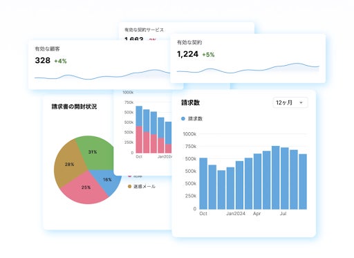 契約情報や実際の請求情報をもとに、売上・MRR・LTV・新規契約数・解約率などの事業指標を自動で算出します。主要な指標はダッシュボードで確認でき、データ集計にかかる負担を大幅に削減します。信頼性の高いデータとして、事業報告や施策立案に活用いただけるほか、請求予実表などの業務用のレポートにも対応しています。