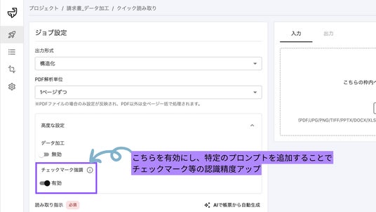 この設定を行うと、OCR処理時にチェックマーク(・や、◯、×など)を自動的に強調し、通常の文字列よりも高精度に識別します。