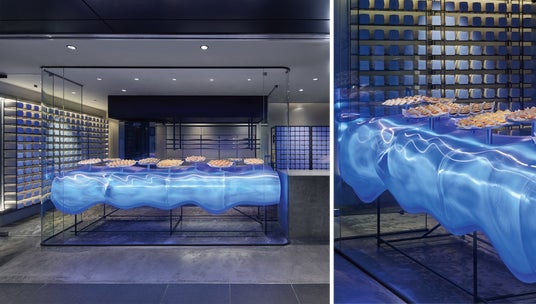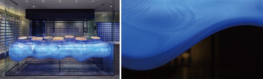 新ブランドカラー「ライラックブルー」を大胆に活用し、行き交う人の視線を引きつける装飾を実現。造形には二重のシェル構造を採用し、見る角度や照明によって“揺らめく印象“を与える仕掛けを施しています。内部に組み込まれた照明が半透明素材を透過することで、空間全体に幻想的な光をもたらしています。