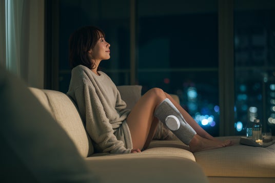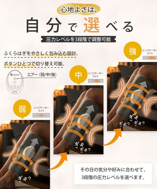 空気圧でふくらはぎをやさしく包み込み、気分や好みに合わせて3段階の強さを選択可能。