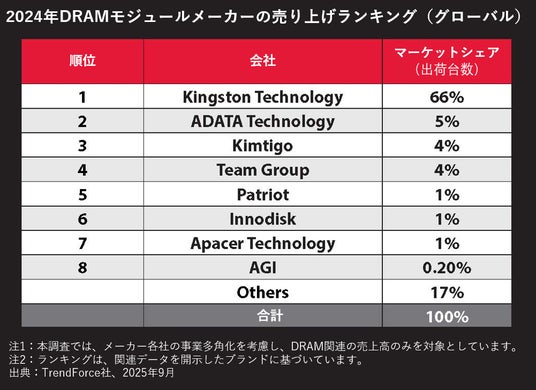 台北 -10月8日, 2025 - メモリストレージ製品および技術ソリューションの世界的リーダーであるKingston Technologyは本日、アナリスト企業であるTrendForce社による最新の売上高別ランキングにおいて、サードパーティDRAMモジュールサプライヤーとして世界トップにランクインしたことを発表しました。Kingston は推定66%の市場シェアを保持し、22年連続でグローバルリーダーの地位を確立。TrendForce によると、2024のDRAMモジュール売上は前年同期比で7%増加し、前年の減少傾向から回復しました。2024年下半期の消費者需要の低迷により、売上成長はやや鈍化したものの、引き続き強力な市場シェアを維持しています。