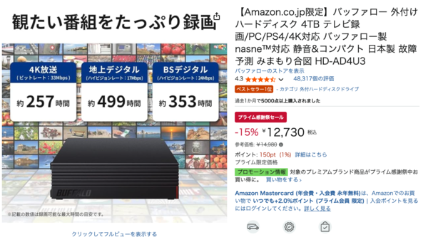 Amazonのプライム感謝祭セールで、バッファローの外付けハードディスク「HD-AD4U3(4TB)」が、プライム会員限定価格12,730円で販売中です。