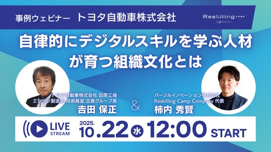 「はたらいて、笑おう。」をビジョンに掲げるパーソルグループのパーソルイノベーション株式会社 Reskilling Camp Company(本社:東京都港区、Reskilling Camp Company代表:柿内 秀賢)が展開する、リスキリング支援サービス『Reskilling Camp(リスキリング キャンプ)』( https://www.reskillingcamp.jp/ )は、10月22日(水)12:00~13:00「自律的にデジタルスキルを学ぶ人材が育つ組織文化」をテーマにトヨタ自動車株式会社 田原工場 エンジン製造部 技術員室 企画グループ長 吉田氏を招き、トヨタ自動車が取り組んだ「デジタル人材育成」ついてオンラインセミナーを開催します。