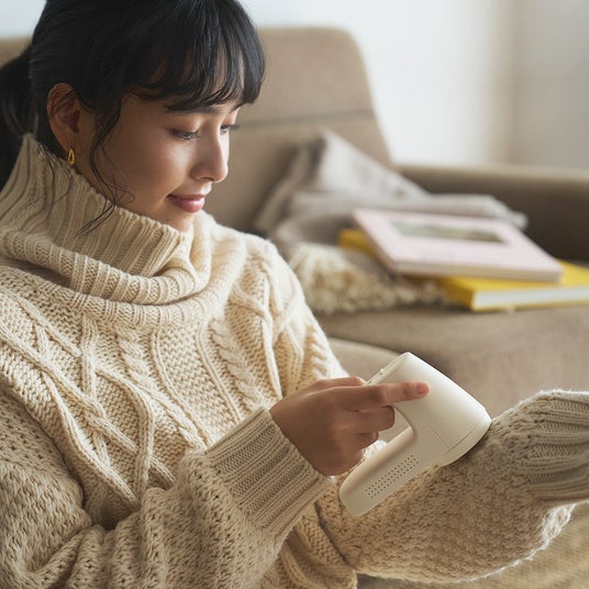 また、機能性だけでなく、暮らしのなかに自然と溶け込むデザインにもこだわりました。インテリアに調和する落ち着いたカラーと、見せ置きしても美しく圧迫感のないミニマルなフォルムを採用しています。使わないときも、付属の「ふわふわリング」や「デリケート外刃*1」もすっきりと収納できるスタンド付きで、リビングや玄関などどこにおいても、生活空間の美しさを損なわないたたずまいを実現しています。使いやすさと美しさを両立した毛玉取り器です。