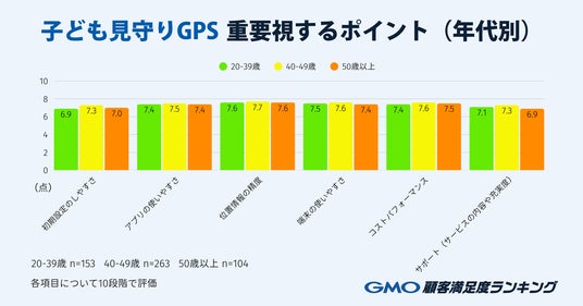 「子ども見守りGPS」を選ぶ際に重視するポイントについて、各項目を10段階で評価する形式で調査したところ、世代間および項目間で大きな差は見られませんでした。微差ではあるものの、最も基本的かつ核心的な機能である「位置情報の精度」がどの世代でも最も重要視するポイントとなっています。