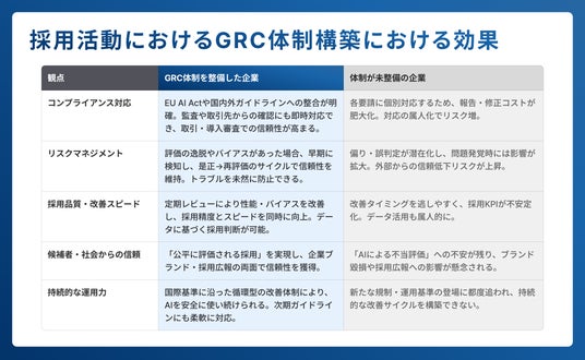 その知見をもとに、採用AIの安全運用を企業のGRC(ガバナンス・リスク・コンプライアンス)体制に統合し、安心して採用AIを活用できる仕組みを構築支援します。