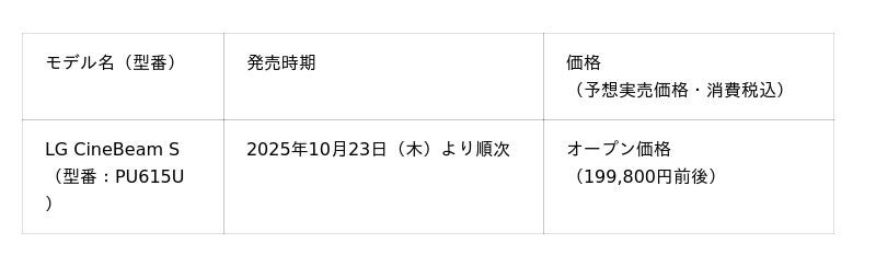 LGエレクトロニクス・ジャパン株式会社(代表取締役:孫 成周(ソン・ソンジュウ)、本社:東京都中央区)は、アタラシイものや体験の応援購入サービスMakuakeでの先行販売で応援購入総額5800万円超を記録した、置き場所フリーの4Kレーザープロジェクター「LG CineBeam S」(型番:PU615U)を、2025年10月23日(木)より順次発売します。