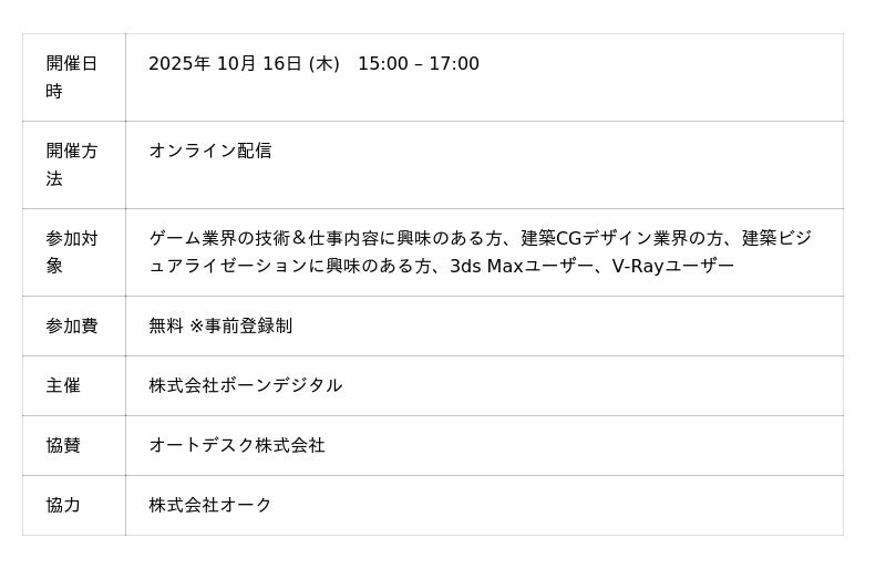 株式会社ボーンデジタル(本社:東京都千代田区、代表取締役:新 和也、URL:https://www.borndigital.co.jp/)は、建築ビジュアライゼーション分野に携わる方々を対象にしたオンラインセミナー「3ds Max & V-Ray 探検隊(建築VIZ)Part 2!! 【建築CG × ゲーム背景 ─ 実は便利!建築CGでも使えるクオリティアップのあれこれ】」を2025年10月16日(木)に開催いたします。