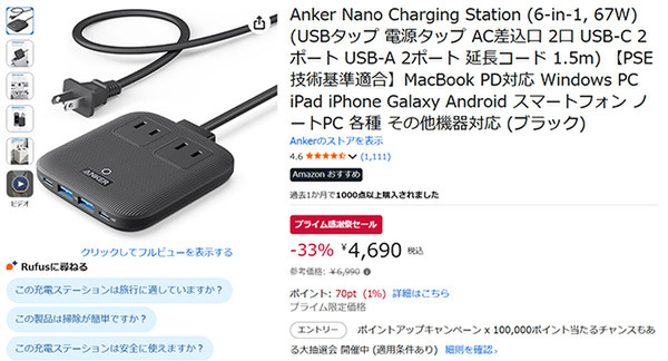 6台を同時充電! Anker Nano電源タップが33%オフで4,690円【プライム感謝祭セール】