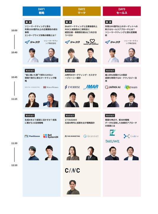 本カンファレンスでは、この大きな転換期を勝ち抜くための答えを探ります。AI時代に求められる「戦略」「マーケティング」「セールス」の最新理論と実践を3日間に凝縮。変化を脅威ではなく機会と捉え、次なる成長の一歩を踏み出すためのインサイトを提供します。