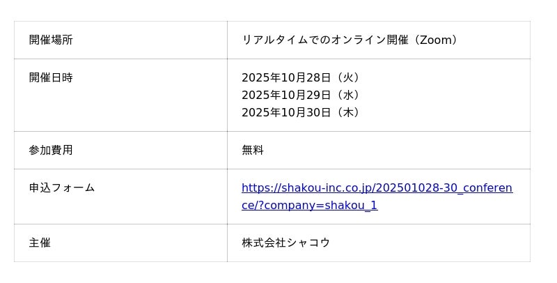 [AIで変わる現場に、本質から向き合う3日間] - 株式会社シャコウ主催、2025年10月28日(火)・ 2025年10月29日(水)・ 2025年10月30日(木)の3日間開催
