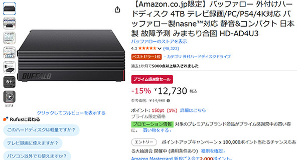 バッファローから、観たい番組をたっぷり録画できる外付けHDD「HD-AD4U3」がAmazonプライム感謝祭セールに登場。