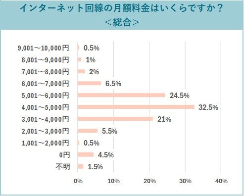 インターネット回線の月額料金は、「4,001~5,000円」(32.5%)が最も多く、次いで「5,001~6,000円」(24.5%)となりました。