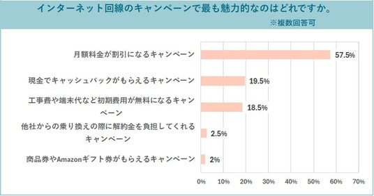 インターネット回線のキャンペーン内容では、「月額料金の割引」に魅力を感じる人が57.5%と、圧倒的多数を占めました。