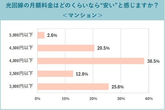 マンションに住んでいる人の場合、安いと感じる光回線の月額料金は「4,000円以下(38.5%)」が最多でした。