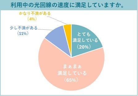 利用している光回線の通信速度については、「とても満足している」(20%)と「まぁまぁ満足している」(65%)を合わせると、全体の85%が満足している結果となりました。