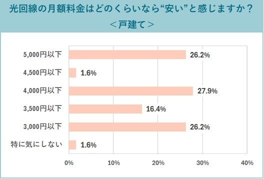 戸建てに住んでいる人が安いと感じる光回線の月額料金は、「3,000円以下」(26.2%)、「4,000円以下」(27.9%)、「5,0000円以下」(26.2%)と、ほぼ横並びの結果になりました。