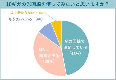 一方で、最大速度10ギガの光回線に「興味がある」と回答した人は38%にのぼり、「今の回線で満足している」(43%)との差はわずか5ポイントでした。高速回線への関心の高さがうかがえる結果となりました。
