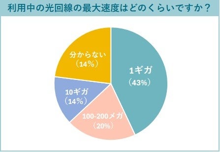 利用している光回線の最大速度については、「1ギガ(1Gbps)」と回答した人が43%で最も多く、次いで「100メガ(100Mbps)や200メガ(200Mbps)」が20%となりました。