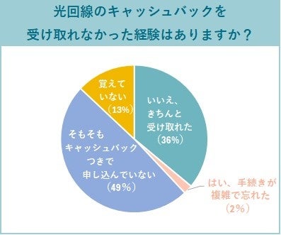 一方で、約半数は「そもそもキャッシュバックつきで申し込んでいない」と回答しており、光回線のキャッシュバックに対する認知度の低さが浮き彫りとなりました。