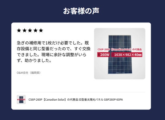 特に掲載中の旧型番太陽光パネルに関して、GBPは廃盤パネルを再入手できない問題に着目し、それと同じ出力・寸法・厚み・取付穴位置と内径を再現した代替品パネルを提供する大好評の商品です(2025年7月時点で累計30万枚を販売)。