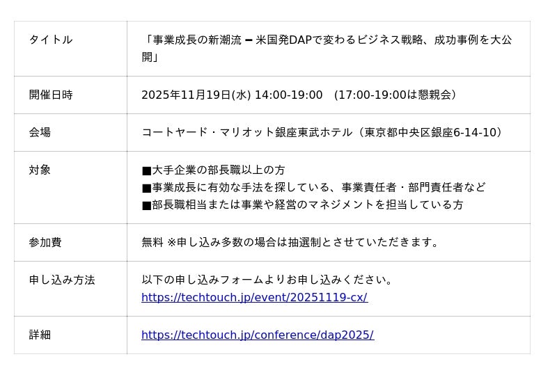 AI型次世代DAP「テックタッチ」を開発・提供し、DAP市場国内シェアNo.1のテックタッチ株式会社は、100名限定のカンファレンス「事業成長の新潮流 ━ 米国発DAPで変わるビジネス戦略、成功事例を大公開」を2025年11月19日(水)14:00から開催します。