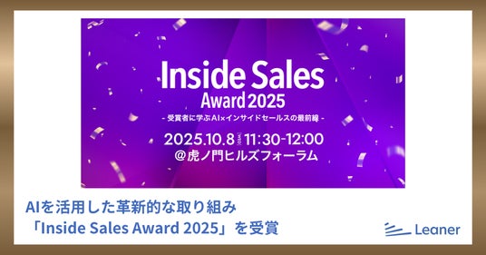株式会社Leaner Technologies(本社:東京都品川区、代表取締役CEO:大平 裕介、以下「リーナー」)は、当社のインサイドセールスチームが、2025年10月8日に開催された「Inside Sales Conference 2025」内で行われた「Inside Sales Award 2025」において、優秀賞を受賞したことをお知らせいたします。