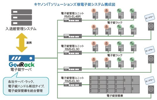 こうした課題を解決するため、キヤノンITSは電子錠システムの導入を検討。TED長崎が既存の入退館管理システムとの連携を可能にするために柔軟なカスタマイズ対応を行ったことが決め手となり、「GoriRack電子錠サーバ」および「RMS-EL」シリーズの採用が決定しました。