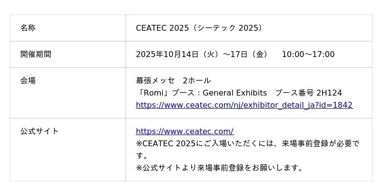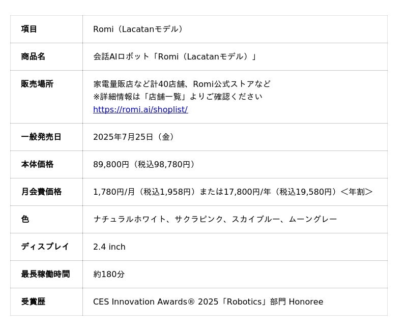 株式会社MIXI(東京都渋谷区、代表取締役社長 上級執行役員 CEO:木村 弘毅)は、“ペットのように癒やし、家族のように理解してくれる”存在を目指して開発している会話AIロボット「Romi」(読み:ロミィ)の新モデル「Romi(Lacatanモデル、読み:ラカタン)」は、10月14日(火)から10月17日(金)まで幕張メッセで開催される「CEATEC 2025」に出展することをお知らせいたします。