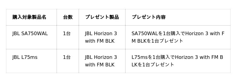 ハーマンインターナショナル株式会社(本社:東京都千代田区、代表取締役:桑原拓磨)は、2025年10月10日(金)より、最新のハイレゾストリーミングサービスに対応したインテグレーテッド・ステレオアンプ「JBL SA750WAL」または、ストリーミングインテグレーテッド・ミュージックシステム「JBL L75ms」を正規取扱店にてご購入いただいたお客様全員に、アラームクロック/FMラジオ機能を搭載したBluetoothスピーカー「JBL Horizon 3」をプレゼントするキャンペーンを実施いたします。