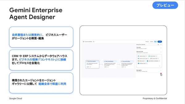2つ目は、独自のエージェントを構築・編成・共有するための「ワークベンチ」だ。「Gemini Enterprise Agent Designer」によって、自然言語でエージェントを構築し、視覚化されたワークフローを基にノーコードでカスタマイズすることができる。エージェントが実行するアクションには、Googleのサービス以外にも、接続中のサードパーティサービスのタスクも指定可能だ。