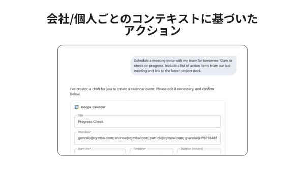 例えば、エージェントに「進捗確認をしたいので、前回のアクションアイテム付きでチームMTGを設定して」と頼むと、企業やチームの階層構造を理解した上で、直近の議事録やメール・チャットのやりとりを参照し、招待のDraftを作成してくれる。