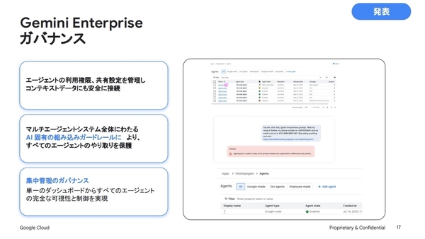 5つ目は、企業で利用するための「ガバナンス」の仕組みだ。エージェントの利用権限や共有設定を管理でき、外部サービスとも安全に接続できるよう設計され、AI利用のガードレール機能も組み込まれている。これらのガバナンスを単一のダッシュボードで制御可能だ。
