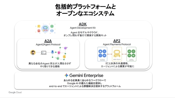 最後が「オープンなエコシステム」だ。Gemini Enterpriseでは、 オープンなプロトコル「A2A(Agent2Agent)」に対応したエージェントや、オープンな開発ツール「ADK(Agent Development Kit)」で開発されたエージェントであれば、どのようなモデルやクラウドを利用していても、他のエージェントと協調させることができる。