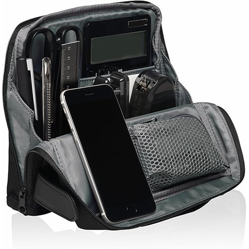 収容物に合わせたさまざまなサイズの機能ポケットがついており、効率よく収容することができます。5.5インチまでのスマホなら立てかけることも可能です。