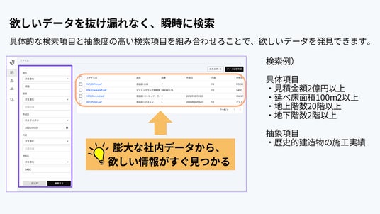 - 高精度検索:生成AIを活用し、非構造データを自動解析