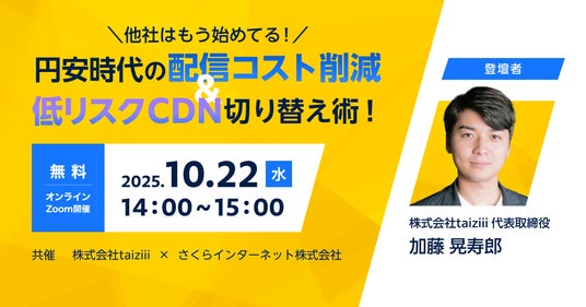 株式会社taiziii(本社:東京都渋谷区、代表取締役:加藤晃寿郎)は、さくらインターネット株式会社(本社:大阪府大阪市、代表取締役:田中邦裕)主催のオンラインセミナー「円安時代に備える配信コスト最適化&低リスクCDN移行術」を、2025年10月22日(水)14:00~15:00に開催いたします。