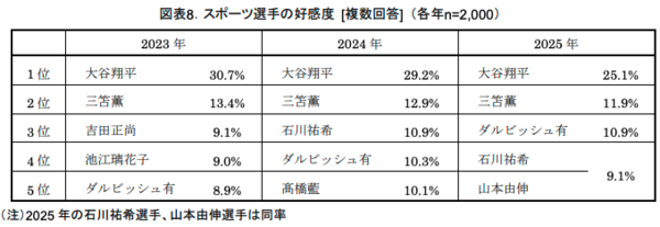また、好きなスポーツ選手ランキングの第1位は、大谷翔平選手で8年連続。第2位は3年連続で三笘薫選手、第3位はダルビッシュ有選手、第4位は山本由伸選手と、メジャーリーグを中心とした海外活躍選手が上位になっている。