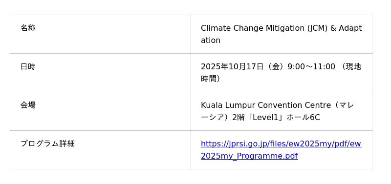本展示会では、常設展示ブース(ブース番号:4)にて実証データや海外での導入事例を紹介するとともに、10月17日(金)開催のビジネスピッチセッションおよび「Climate Change Mitigation (JCM) & Adaptation」セッションにて登壇します。