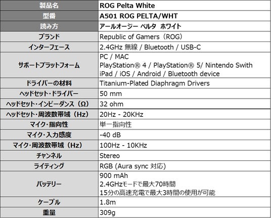 ASUS JAPAN株式会社は、ゲーミングブランドのRepublic of Gamersより、軽量で無線接続にも対応したヘッドセットのホワイトモデル「ROG Pelta White」を発表しました。