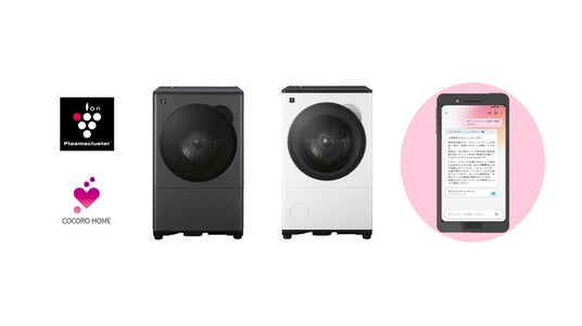 左から、プラズマクラスタードラム式洗濯乾燥機<ES-8XS1-H(グレイングレー)/-W(ラスターホワイト)>、「COCORO HOME AI」トーク画面イメージ