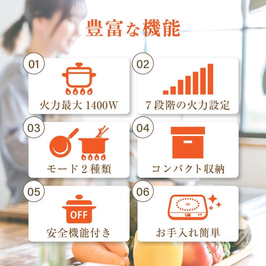 操作はシンプルながら、機能は豊富でうず電流や6段階の火力設定で多彩な調理法を実現、料理の幅を広げ、食卓を豊かに彩ります。