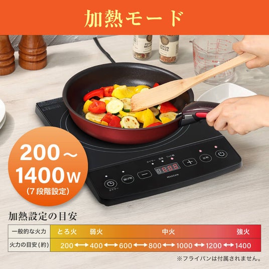 本製品には、加熱モードと揚げ物モードの2つのモードが搭載されており、どのモードも火力・温度をそれぞれ7段階の範囲で設定することが出来ます。
