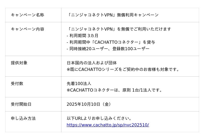 法人向けリモートアクセスサービス「CACHATTO(カチャット)」を開発・提供するe-Janネットワークス株式会社(本社:東京都千代田区、代表取締役:坂本史郎)は、複数種のリモートアクセス用ツール、安全な通信手段、クラウド/オンプレミスとの連携機能をワンストップで提供し、これらをクラウド上で統合的に管理・運用を可能とする「CACHATTO One(カチャット ワン)」の一機能である クラウドVPNサービス「ニンジャコネクトVPN」の無償利用キャンペーンを2025年10月10日より開始することを発表します。