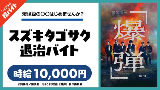 10月31日(金)に都内で開催される、映画『爆弾』のイベントにて、“スズキタゴサク退治バイト”(イベントの補助業務)を行う超バイトを募集します。本映画は、山田裕貴、伊藤沙莉、染谷将太、佐藤二朗、等の豪華俳優陣が出演します。
