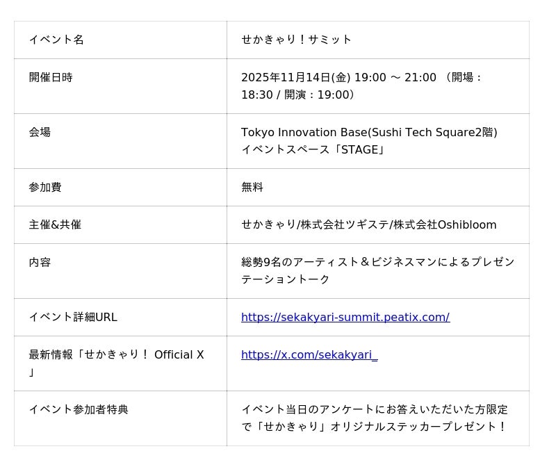 「推しが永遠にいなくならない世界線」を目指し、AI推し活プラットフォーム「Oshimy(オシマイ)」を運営する株式会社Oshibloom(本社:東京都墨田区、代表取締役社長:柴田瞳)は、『せかきゃり!サミット』に共催として参加します。