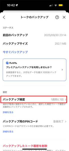iPhoneなどiOSを利用している場合、iCloudを使ってトーク内容のバックアップができる。任意のタイミングでバックアップする「手動設定」のほか、設定した頻度で自動的にバックアップする「自動設定」もできる。もしものときのために、自動バックアップ設定をしておくと安心だ。頻繁にトークをする場合は「毎日」など、適切な頻度を選択しよう。