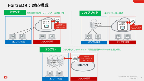 またレガシーOSは、インターネットと隔離されたネットワーク内で運用されていることが多いが、FortiEDRは、そうした環境でも運用できるよう設計されている。具体的には、FortiEDRの管理サーバーは、クラウド環境だけでなくオンプレミス環境にも配置することができる。さらには、クラウドとオンプレミスの管理サーバー間を連携させて、ハイブリッド型の統合管理環境を構成することも可能だ。