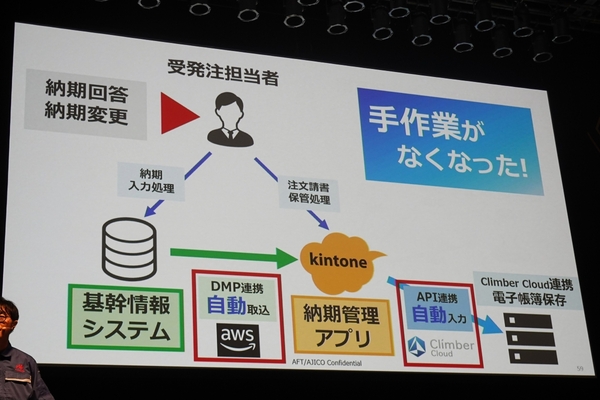 さらに、kintoneの外部連携機能によって、オンプレミスの基幹システムから、kintoneへデータを自動で取り込む仕組みを構築。他にも、電子帳票やAPI連携などを駆使して、納期管理における手作業を排除していった。