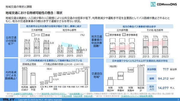内山氏は、全国で少なくとも2,000地区以上で「交通空白」が存在し、利用者減や運転手不足を背景に路線廃止が加速している現状を指摘。地方都市では公共交通の分担率が極めて低く、事業者の9割が赤字を抱えている。